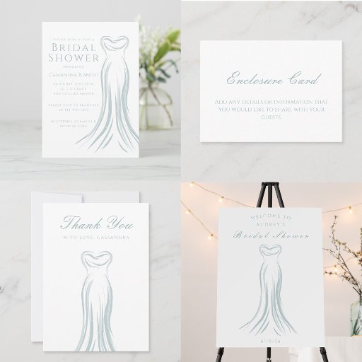 Esta carta de agradecimiento está decorada con un bonito y elegante vestido de novia en tonos azul claro con un toque de brillo. Este producto se puede adquirir para su descarga impresa o digital.
