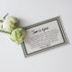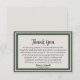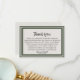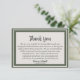 Una forma hermosa de honrar la vida de un ser querido es enviar tarjetas de agradecimiento a aquellos que asistieron al servicio o lo ayudaron en su momento de duelo. Esta tarjeta de agradecimiento elegante y simple con un borde verde clásico hace las cosas un poco más simples para usted durante la difícil temporada. Utilice el mensaje de agradecimiento ya proporcionado o cree su propio mensaje personalizado.