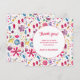 Una pintura acuarela de flores y hojas con colores vivos diseminados en un fondo blanco. Una magnífica tarjeta de correspondencia para agradecer a sus bodas invitados por un día maravilloso.