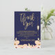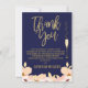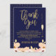 Esta tarjeta de agradecimiento para la fiesta de compromiso presenta un texto de caligrafía con pincel dorado falso y una copa de champán alta y elegante sobre un fondo azul marino. El diseño también incluye un arreglo floral parcialmente acuarelado en la base del diseño. La parte trasera de la invitación también es azul marino con un patrón de lunares dorados falsos al azar. La invitación para la fiesta de compromiso del mismo diseño está disponible en la tienda. Esta tarjeta de agradecimiento para la fiesta de compromiso está lista para ser personalizada.