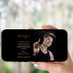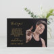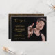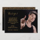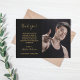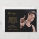 Una tarjeta de agradecimiento elegante y moderna para graduación de fotos. Fondo de color negro. Con el texto: ¡Gracias! escrito en un guión de estilo con letras a mano, letras de oro. Plantillas para la foto del graduado, nota de agradecimiento y nombre, letras de oro. Fondo negro con confeti dorado.