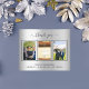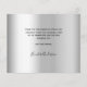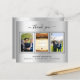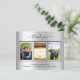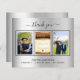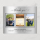 Agrega 3 de tus fotos, tamaño vertical, una fecha, nombre y la nota de agradecimiento. Un fondo falso de aspecto plateado con texto negro y marco. El texto: Gracias en la parte delantera y tu nombre en la parte trasera está escrito con un elegante guión con letras a mano con barras.
