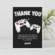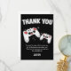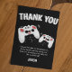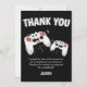 Envía una tarjeta de agradecimiento extra especial a tus amigos, agradeciéndoles por asistir a tu fiesta y gratitud por sus regalos. Con dos controles de juego sobre un fondo negro, con texto divertido que dice "GRACIAS" y "Disfruté del pastel y el regalo también, pero mi parte favorita fue verte! GRACIAS POR VENIR A MI FIESTA Y POR EL REGALO MARAVILLOSO" y "SU NOMBRE". Todos los estilos de fuente y colores de fondo se pueden cambiar haciendo clic en el enlace personalizar más después de personalizar.
