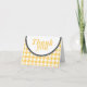 Estas elegantes tarjetas de agradecimiento están diseñadas con "gracias" en negrita cursiva amarilla en un semicírculo blanco sobre un patrón de galas amarillas y blancas. Este patrón es una elección elegante para duchas de novias y cumpleaños. El interior es personalizado impreso con tu propio texto, o el texto de la plantilla puede ser borrado fácilmente para dejar el interior de estas tarjetas en blanco para escribir a mano tus sentimientos de agradecimiento. Sin orden mínima. Existen descuentos masivos.