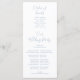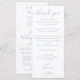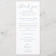 Una elegante tarjeta de agradecimiento para recepción de boda en azul polvoriento, personalizada con su mensaje especial de agradecimiento en tipografía elegante y programa de eventos y cortejo nupcial en el reverso. Un especial recuerdo de agradecimiento para sus invitados. Diseñado por Thisisnotme©