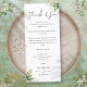 Una elegante tarjeta de agradecimiento para la celebración de una boda con vegetación floral. Personalizada con su mensaje especial de agradecimiento en tipografía elegante. Un especial recuerdo de agradecimiento para sus invitados. Diseñado por Thisisnotme©