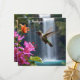 Se muestra un colibrí flotando frente a una cascada de camino a libar algo de néctar de las flores cercanas.