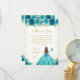 Esta elegante y glamorosa tarjeta de agradecimiento de cumpleaños presenta una hermosa princesa con el pelo rojo marrón y la piel clara en un verde azulado vestido de bola azul. El texto combina el guión manuscrito y las fuentes sans serif modernas para un aspecto elegante y sofisticado. Los arreglos florales, las mariposas y los confeti dorados crean una perfecta mezcla de rústico y moda. Gráficos de www.etsy.com/uk/shop/SunflowerDayLove