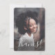 Esta simple y linda tarjeta de agradecimiento con foto presenta una foto de frente a sangre, con texto elegante que dice "¡Gracias!". La parte trasera de la tarjeta contiene un diseño de rayas de arcoíris pastel en púrpura pervinca, azul aqua, verde menta, melocotón coral y rosa claro. Las plantillas de texto están incluidas en la parte trasera para personalizar. ¡Perfecto para enviar después de una fiesta de cumpleaños para una niña preadolescente o adolescente! Para solicitudes de diseño personalizado o producto, por favor contacte conmigo (Tracey) en orabellaprints@outlook.com.