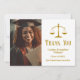 Elegante graduado de facultades de Derecho tarjetas de agradecimiento con la escala de justicia junto a su foto de graduación. Personalizar estas tarjetas de agradecimiento del abogado con moda de oro junto a la fotografía de su abogado.