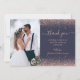 Personalizar esta elegante tarjeta de agradecimiento de boda con su foto vertical de boda a la izquierda. Las palabras "gracias" aparecen a la izquierda en escritura manuscrita rosada subió, con abundancia al principio y al final. Agregue un mensaje de su elección en texto cursiva sobre un fondo azul oscuro con bordes purpurinas falsos de oro rosa. Añade tus nombres y la fecha de boda al revés sobre una marca azul.