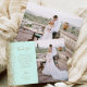 Send your family and friends a special wedding thank you with these custom photo cards. A vertical photo appears on the right half. On the left, the words "Thank You" appear in elegant gold-colored handwriting script typography on a mint green background over a brief, editable message of thanks to your wedding guests in copperplate font, with your names below. A gold faux glitter border decorates the left edge. The reverse side provides space for a second, horizontal photo.
