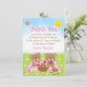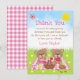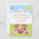Esta adorable y caprichosa tarjeta de agradecimiento presenta ositos adorables disfrutando de un pícnic en un mantel gingham rosa con golosinas como miel, sandía, mermelada de fresa, limonada y pastel. Al fondo hay un cielo azul brillante y sol, mariposas y margaritas. El texto combina fuentes decorativas y serif para un look elegante y moderno. Esto es perfecto para una fiesta de cumpleaños de primavera o verano.