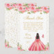 This elegant and glamorous birthday thank you card features a beautiful princess with dark hair and dark skin in a pink ball gown. The text combines handwritten script and modern sans serif fonts for a classy and sophisticated look. The floral arrangements, butterflies and gold confetti create the perfect blend of rustic and chic.