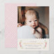 Announce the arrival of your beautiful baby girl with this simple and sweet birth announcement. The name of your baby, as well as the birth information, is framed by a wreath of delicate flowers and leaves. The top of the design features a pretty scalloped border. There is also space for a large photo of your new addition. The back of the card features a pink, hand-drawn gingham pattern... Be sure to check out the coordinating self-addressed envelope.