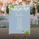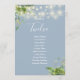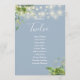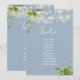 Estas elegantes luces de cadena florales botánicas de vegetación con números de mesa para bodas pueden ser personalizadas con el plan de asientos de sus invitados en tipografía chic sobre un fondo azul polvoriento. Las tarjetas están impresas en el anverso y reverso (doble cara). Diseñado por Thisisnotme©