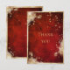 Precioso spray floral botánico blanco con hojas doradas dispersas sobre esta hermosa tarjeta de “Gracias” de boda. El fondo rojo escarlata rústico es una mirada rica y chic. Esta es una tarjeta encantadora. Recortada en falso brillo dorado para establecer el tono para una elegancia romántica y clásica. Salpicaduras de oro terminan esta bonita nota de “Gracias” de boda. Hermosa para cualquier temporada.
