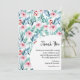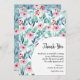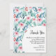 Una tarjeta de agradecimiento plana para una ducha de bebé está decorada con encantadoras imágenes de plantas acuarelas con suaves hojas de esmeralda y azul pastel, ramas y rosas suaves.