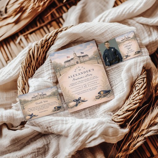 Celebrate a proud milestone with this elegant police academy graduation design, featuring a refined neutral palette, classic law enforcement details, and a formal ceremonial layout. Inspired by traditional graduation announcements, this design highlights service, achievement, and dedication with timeless style. Perfect for honoring a new police officer and sharing this meaningful accomplishment with family and friends.
