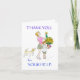 Una práctica tarjeta para decir gracias por la ayuda recibida, quizás acompañando un regalo de agradecimiento. Dos niños, con un perro, están ofreciendo flores y vino: de una pintura al acuarela de Judy Adamson.