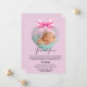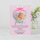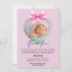 Esta tarjeta de agradecimiento para una niña dulce y elegante presenta un fondo rosa pastel, una proa acuarela y un marco fotográfico en forma de corazón para mostrar la foto de un recién nacido. Perfecto para anunciar la llegada de su pequeña y expresar su más sentida gratitud a sus amigos y familiares.