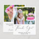 Tarjeta de agradecimiento económica para su fiesta de cumpleaños con su foto y "Gracias" en un elegante guión contemporáneo con un toque de corazón. Personalice con su nombre y la fecha del evento en una simple tipografía moderna. Al revés, agrega una foto adicional, su mensaje personalizado de agradecimiento y su nombre en un guión tipo firma.