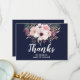 Tarjeta de agradecimiento por ser mi dama de honor con flores campestres y letra blanca moderna. La parte delantera y trasera de la tarjeta es de un azul marino chic.