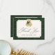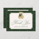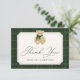 Share your appreciation with this charming baby shower thank you card featuring a hand-painted watercolor teddy bear wearing a cozy green scarf. “Thank You” appears below in elegant green script, with space to personalize your name. The text is arranged within a vintage-style cream frame and set against a watercolor green plaid background, creating a classic, polished look. The back allows you to include your own message, offering a meaningful way to thank your guests.