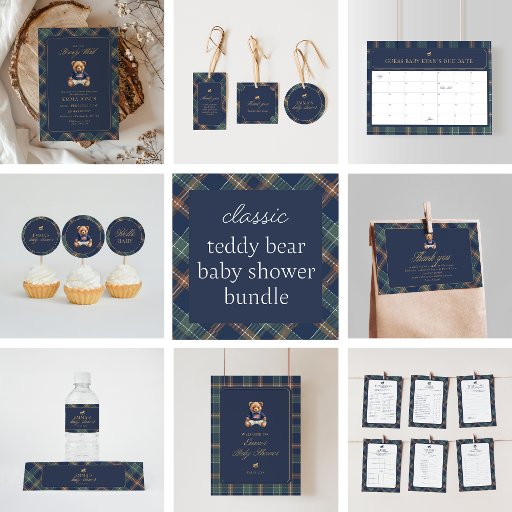 This elegant baby shower thank you card features a sweet teddy bear illustration paired with a classic plaid background for a timeless, refined look. Designed for boy baby showers, it’s perfect for expressing heartfelt gratitude to guests who shared in this special celebration. The warm, traditional style makes it ideal for preppy, vintage, or teddy bear themed baby showers. A beautiful keepsake that coordinates seamlessly with matching invitations and shower stationery.