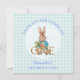 Personalice a este Pedro el conejo sentado sosteniendo un diseño de zanahoria y añada un nombre y la ocasión. Atrás: Gracias en texto dorado