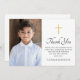 Elegante First Holy Communion, tarjeta de agradecimiento con plantilla de foto y su mensaje de agradecimiento personalizado. La cruz de aspecto dorado falso (gradiente de color impreso, NO Relieve metalizado real) sobre un fondo de color blanco o personalizado. Puede cambiar todos los colores de la herramienta de diseño.