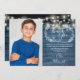 Personalice con su foto y su primer mensaje especial de agradecimiento a la comunión sagrada en letras de moda en este elegante diseño rústico con luces de cuerda y guirnaldas de follaje dibujadas a mano sobre un fondo de paneles de madera azul. Diseñado por Thisisnotme©