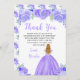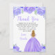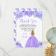 Esta tarjeta de agradecimiento para fiesta de cumpleaños cuenta con flores florales púrpuras con brillo falso y una hermosa princesa con cabello rubio y un vestido elegante. Esto es perfecto para una fiesta de cumpleaños.
