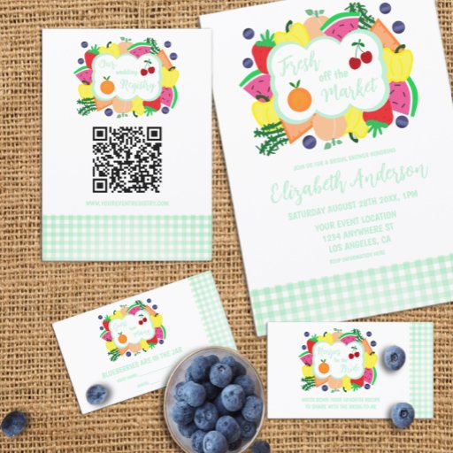 ¡Ya está fuera del mercado! Despedida de soltera con frutas y verduras dibujadas a mano con un acento de gingham verde menta