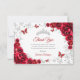 Red silver Quinceanera celebration thank you card. Features, script font, butterflies, watercolor roses and tiara. Perfect for an elegant princess style glam celebration. Personalize with your own details.