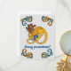 A cute yellow creature with a beak and two legs hugging a Christmas present. It has reindeer horns decorated with blue ribbon bells. Text says “marry presentsss!” suggesting a possessive nature of the adorable monster. The corners are decorated with coloured intricate design in art nouveau style forming a frame. Feel free to customise the text!