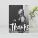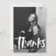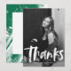 Tarjeta de agradecimiento para graduación moderna que presenta la foto del graduado con "grad" en un guión de pincel blanco. Personalice la parte delantera de la tarjeta de agradecimiento de graduación agregando el nombre del graduado, la escuela, el nombre y el año de graduación. En la parte posterior de la tarjeta hay espacio para el mensaje escrito a mano o con tipeado con un fondo de pinceladas verdes pintadas.