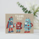 Esta divertida tarjeta plana de agradecimiento es perfecta para niños. Tiene ilustraciones lindas de robots de estilo retro en tonos de rojo y azul en la parte frontal junto con el mensaje ¡GRACIAS! contra un fondo de color marrón claro. El reverso también tiene un gráfico de robot junto con un área rayada para un mensaje de agradecimiento escrito a mano.