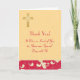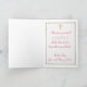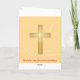 Esta tarjeta de agradecimiento de boda está decorada con una cruz cristiana dorada y barras de damasco rojas de labial y doradas sobre un fondo de damasco dorado.