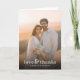 This wedding thank you card features a romantic and elegant design with two individuals standing closely together against a warm, sunset backdrop. The color palette is dominated by soft golds, peaches, and creams, creating a serene and intimate atmosphere. Floral motifs are highlighted by a bouquet of white and pale yellow flowers held by one individual, adding a touch of natural beauty. The typography includes the phrase "love & thanks" in an elegant script font, followed by names in a formal serif font, enhancing the heartfelt mood. Ideal for expressing gratitude after a wedding, this card combines photographic elements with artistic enhancement to convey warmth and affection.