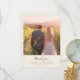 This wedding thank you card features a romantic and elegant design with a couple walking hand-in-hand through a vineyard, bathed in the warm glow of a setting sun. The color palette is dominated by soft golden hues and deep greens, creating an intimate and serene atmosphere. The layout captures the couple from behind as they gaze into the distance, emphasizing simplicity and elegance. The typography includes stylish script for "Thank you" and well-spaced serif letters for names, enhancing the polished look. Perfect for expressing gratitude after a memorable celebration, this card conveys a mood of love and tranquility.