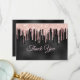 Tarjeta de agradecimiento con monograma de rosa chic y brillo negro que gotea. Tarjeta de Navidad brillante y linda con brillo. Perfecta para enviar a familiares o amigos durante la temporada de fiestas, cumpleaños o cualquier otra ocasión. Para hacerla aún más especial, está adornada con hermoso brillo falso. Este diseño también se puede transferir a cualquier producto en Zazzle. Puedes personalizarlo con tu propio texto e información.