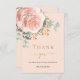 Una carta de agradecimiento de cumpleaños moderna y elegante. Un fondo de color melocotón de moda. Decoradas con rosas de color oro y rosa rosa pálido, flores y hojas de eucalipto de color verde acuático, brotes, vegetación y brotes de oro falsos. Letras negras y doradas. Al frente del texto: Gracias, nombre y fecha. Parte posterior: plantilla para su nota de agradecimiento y nombre.