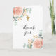 Fondo blanco, florales de oro rosa y vegetación eucaliptus. Gracias está escrito con un tipo de letra con letras a mano grande. Adentro: Una gran foto dentro y su nota de agradecimiento. Volviendo: una segunda foto.