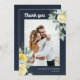 Esta romántica tarjeta de agradecimiento floral elegante es perfecta para cualquier boda elegante. El diseño botánico presenta una sofisticada acuarela de rosas amarillas, complementada con delicada vegetación y hojas doradas (oro falso) sobre un elegante fondo azul marino. Personalice la tarjeta con una de sus fotos favoritas del día de la boda y sus nombres y la fecha del boda en la parte delantera, y una segunda foto con su mensaje de "Gracias" personalizado en la parte posterior de la tarjeta. Para mayor personalización o pedidos de personalizados, no dudes en contactarme en acherryonthecake@hotmail.com (por favor, espere entre 1 y 2 días hábiles). Esta tarjeta forma parte de nuestra colección "Boda de Rosas de color amarillo" con muchos elementos de coordinación para crear una suite boda única.