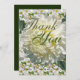 Las rosas blancas florecientes teñidas de amarillo y realzadas por el hermoso crisantemo blanco rodeado de follaje verde, resaltan esta elegante tarjeta de "agradecimiento" que está esperando ser enviada a todos los que se unieron para hacer de su día de boda un evento inolvidable.