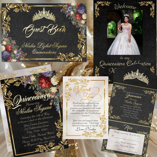 Floral & Gold Leaves - Black & Pearl QuinceneraDiseñado por Beth Harsh