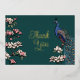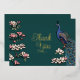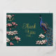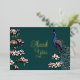 Esta carta rústica Verde azulada y Gold Peacock Thank You Card incluye un moderno pavo real azul/verde azulado de estilo Chinoiserie encaramado en un árbol de magnolia con flor. En la parte posterior aparece el mensaje de agradecimiento personal y los nombres de novia y Groom. Elegante fondo verde azulado.