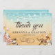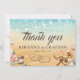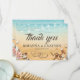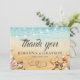 Bodas de playa tropical: gracias a las tarjetas que presentan un fondo rústico de color amarillo oscuro a azul acuarela, pez estrella, conchas, luces de cuerdas, dos corazones en la arena con sus iniciales, y una elegante plantilla de apreciación de bodas que es fácil de personalizar.