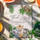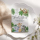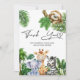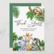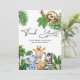 Expresa tu gratitud con estilo con esta encantadora tarjeta de agradecimiento con tema safari. Con un perezoso juguetón, una jirafa adorable, una cebra y un elefante rodeados de exuberante vegetación tropical, esta tarjeta es la forma perfecta de agradecer a tus invitados por hacer que tu baby shower sea aún más especial. La fuente elegante manuscrita añade un toque sincero a este encantador diseño.